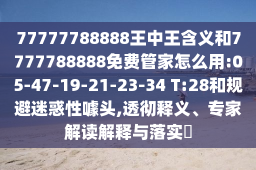 摘要:,,關(guān)于數(shù)字組合“王中王含義”和“77777788888”的解釋尚未明確提供,需要進(jìn)一步查詢(xún)相關(guān)資料或咨詢(xún)專(zhuān)家以獲取準(zhǔn)確含義。關(guān)于免費(fèi)管家使用方式,建議聯(lián)系相關(guān)平臺(tái)或服務(wù)提供商獲取具體的使用指南和操作說(shuō)明。在使用任何服務(wù)時(shí),應(yīng)警惕迷惑性噱頭,理性判斷并落實(shí)相關(guān)解釋和建議。如有疑問(wèn),可咨詢(xún)專(zhuān)業(yè)人士獲取專(zhuān)業(yè)解讀。